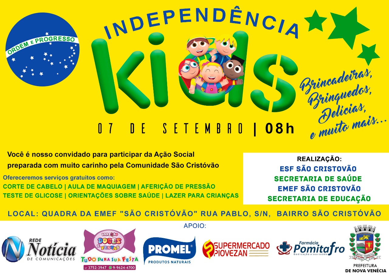 Aproveitando o feriado de 07 de setembro, alusivo ao Dia da Independência do Brasil, as equipes da Secretaria de Saúde e Secretaria de Educação, através do ESF São Cristóvão e EMEF São Cristóvão, estarão realizando um evento social, intitulado Independência Kids, que visa levar lazer e diversão às crianças carentes do Bairro São Cristóvão.