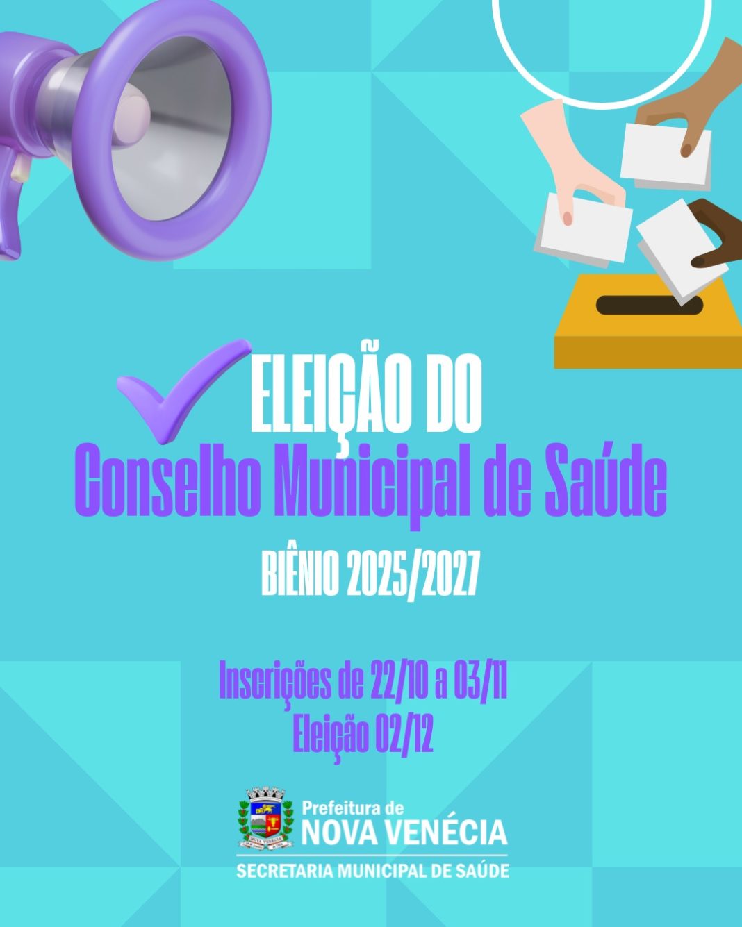 A Comissão para Eleição do Conselho Municipal de Saúde de Nova Venécia anuncia eleição para nova composição para o mandato do biênio 2025-2027. A eleição ocorrerá no dia 2 de dezembro, mas o processo eleitoral começa nesta terça-feira (21), com a publicação do regimento.