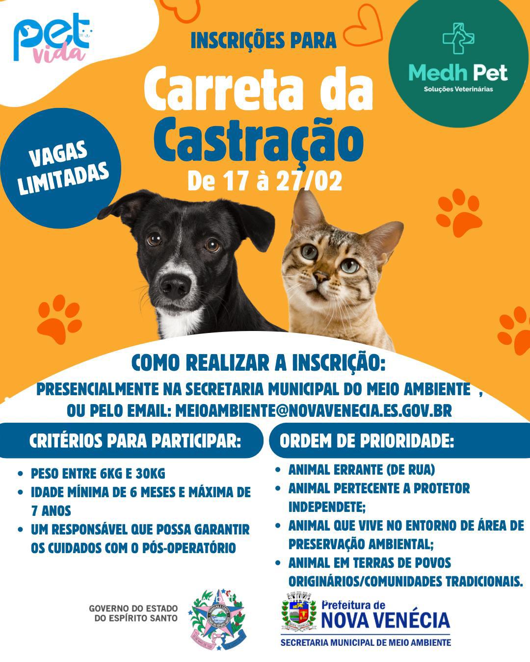 Uma ótima notícia para os donos de cães e gatos de Nova Venécia! A partir desta segunda-feira, dia 17, estarão abertas as inscrições para a Carreta da Castração Animal, uma iniciativa, promovida pelo Governo do Estado, por meio da Secretaria Estadual de Meio Ambiente e Recursos Hídricos (SEAMA-ES), através da Prefeitura Municipal, Secretaria Municipal de Meio Ambiente e o Consórcio CIM Norte, tem como objetivo o controle populacional de cães e gatos do município.