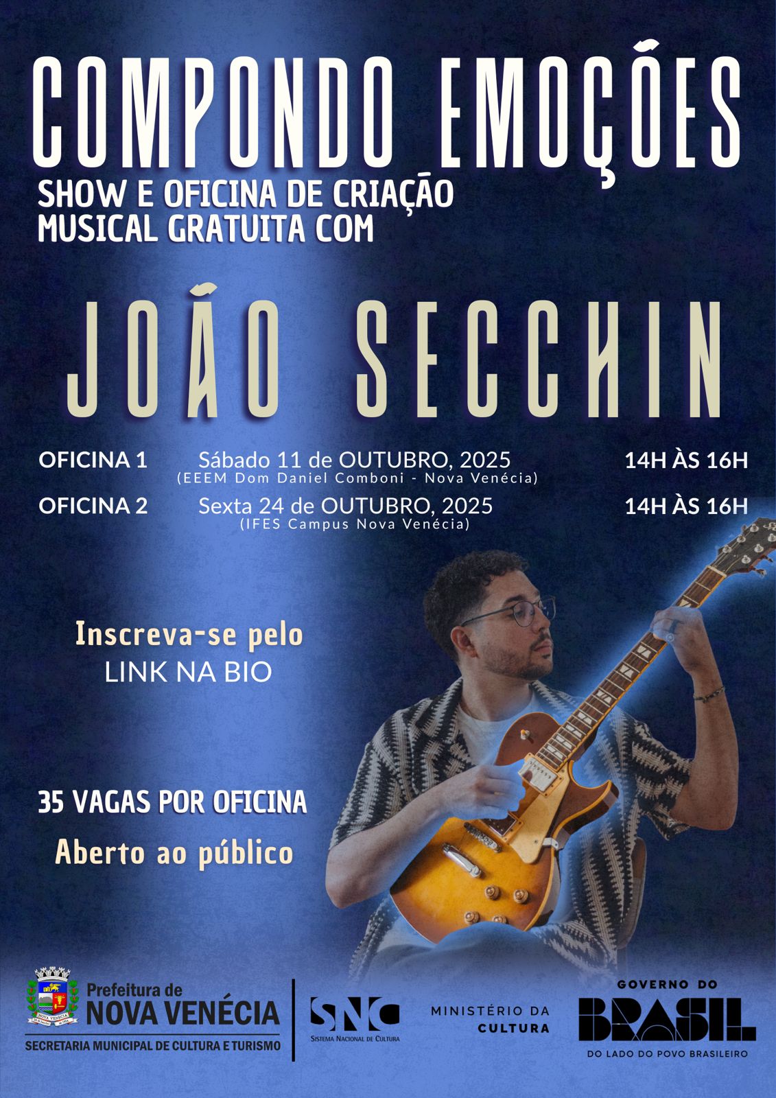 A Prefeitura de Nova Venécia, por meio da Secretaria Municipal de Cultura e Turismo (Sectur), em parceria com o Programa Nacional de Apoio à Cultura (PNAB) do Governo Federal, vai receber o projeto “Compondo Emoções”, do cantor e compositor João Secchin.