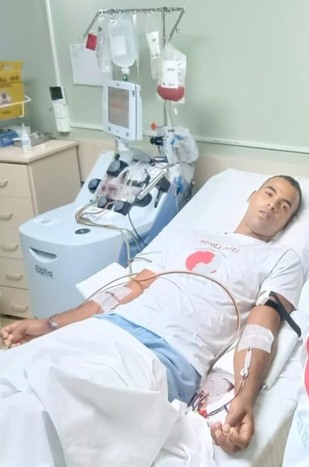 A doação do Ricardo teve o tempo de 4 horas, foram quatro horas separando as células-tronco do sangue. O local de doção é em uma sala, parecida com ambiente de hemodiálise. O paciente fica deitado, podendo assistir TV, conversar, ou dormir, pode comer, só não pode levantar. O sangue passa pela máquina, é filtrado, e volta para o corpo.